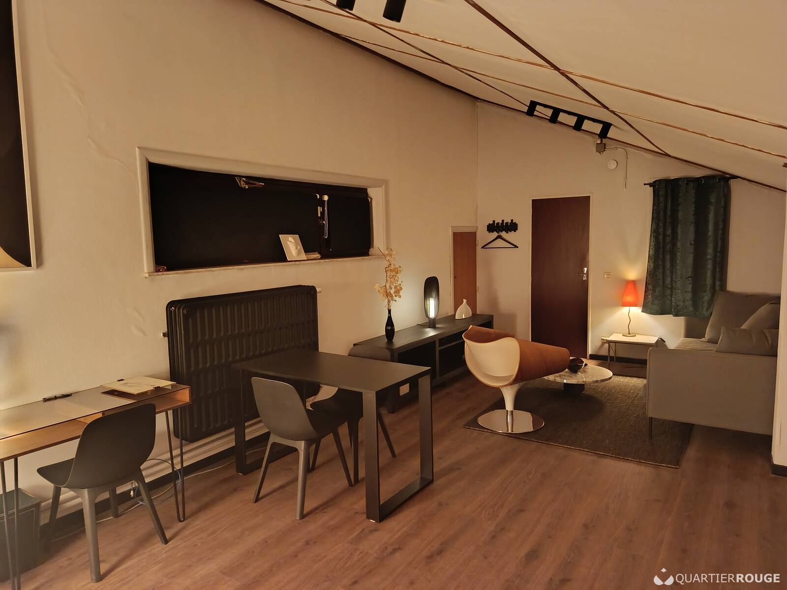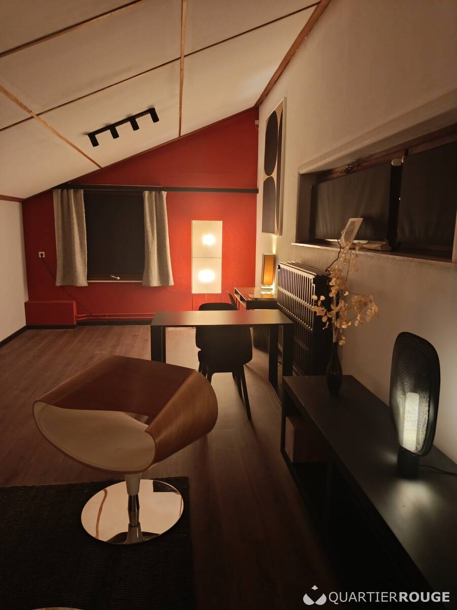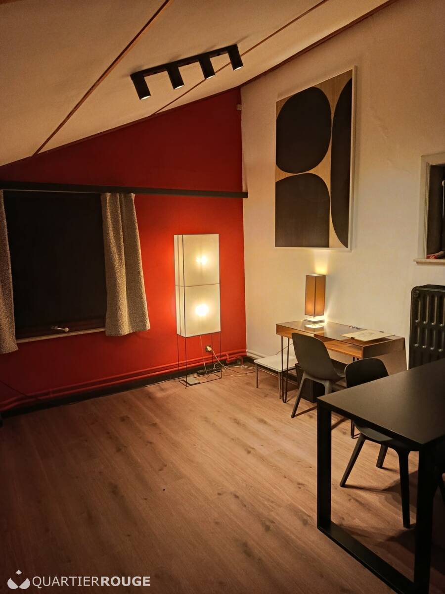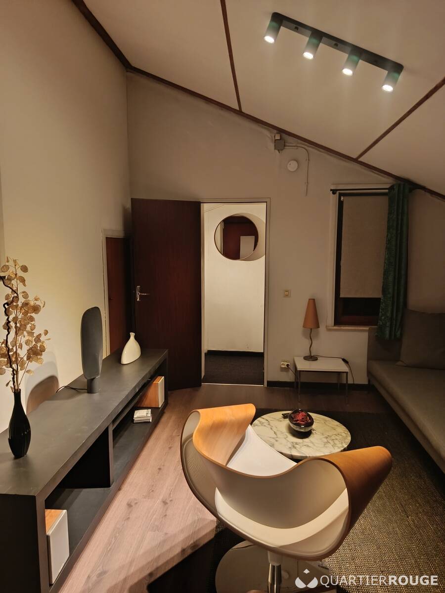 A louer joli Studio de 28 m2 au 1er étage d'une villa 4 façades de standing. Le lieu est très lumineux et composé de 4 fenêtres toutes accompagnées de leurs stores occultant pour assombrir la pièce dans les moments opportuns ainsi que de rideaux chaleureux pour embellir l'ensemble. Villa entièrement re-modernisée à l'exception de la sdb prévue courant 2026. La pièce est composée d'un grand canapé Danois confortable et design, de tasseaux muraux, d'un joli parquet et tapis de sol et d'une table de salon e marbre. Complémentairement un long meuble de décoration avec petite installation audio de qualité et une TV pour vous détendre dans les moments de repos sera prévue prochainement. La liaison internet câblée et wifi est bien entendu inclue.