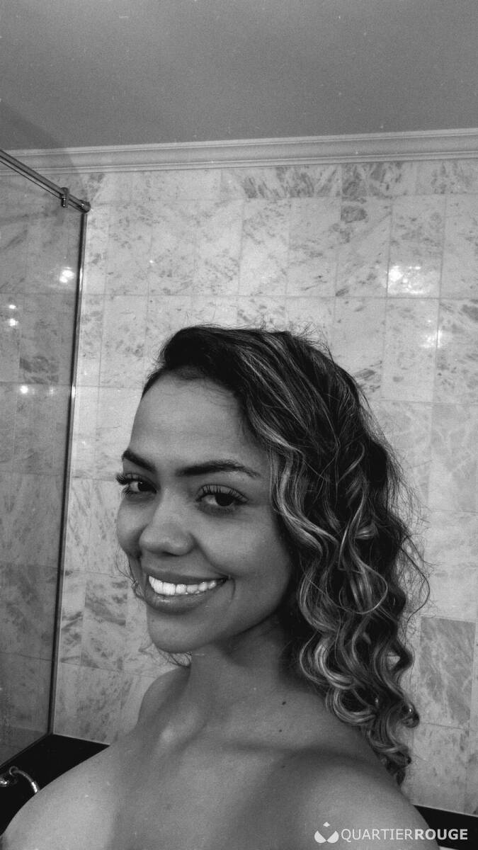 Une silhouette élancée et élégante, aux courbes douces et à la taille fine qui accentue la féminité. Cheveux ondulés et bronzés avec des reflets blonds qui brillent au soleil. Une peau foncée et radieuse qui semble avoir été embrassée par le soleil. Des yeux souriants et une bouche pleine qui invite à rêver. Une femme qui respire la confiance et la sensualité, avec une présence à la fois discrète et marquante.