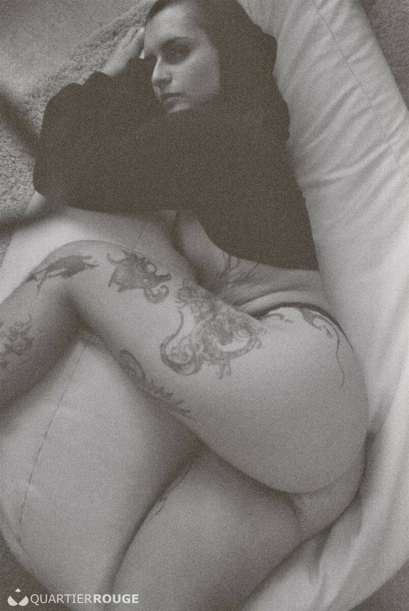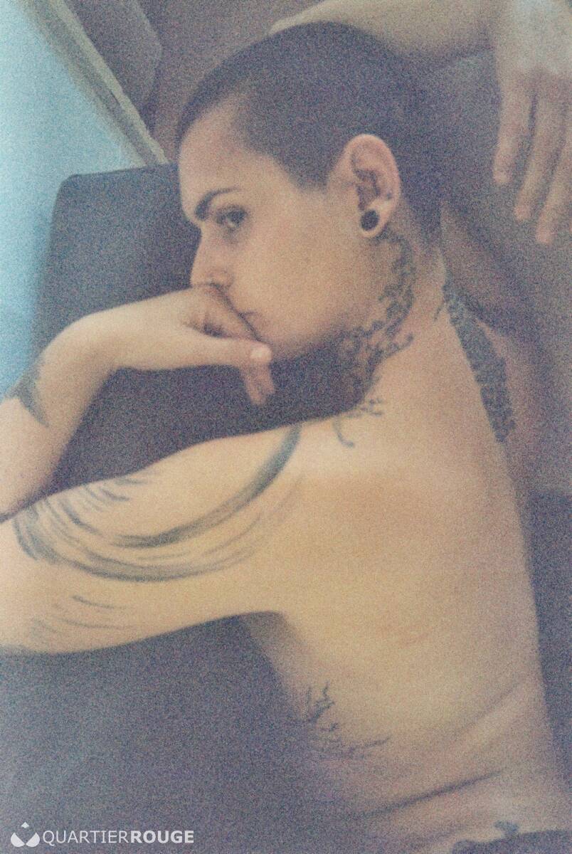 Je suis une femme androgyne tatouée de la tête aux pieds et percée des tétons au nombril.