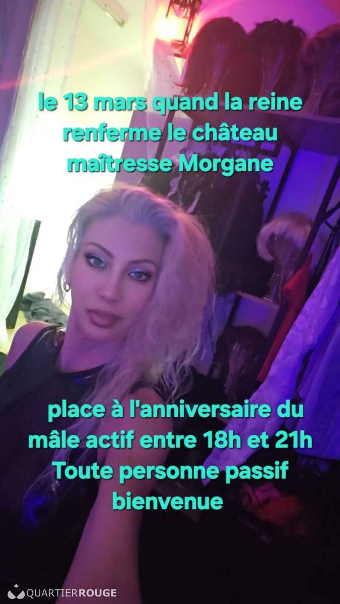 Maîtresse Morgane, accompagnée d’un homme actif, propose des séances individuelles destinées aux soumis, hommes ou personnes travesties.