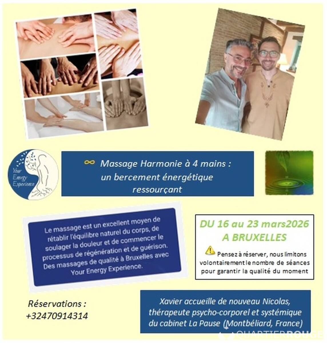 Du 17 au 23 mars, je proposerai un massage harmonisant à 4 mains avec Nicolas, masseur et thérapeute psycho-corporel basé à Montbéliard