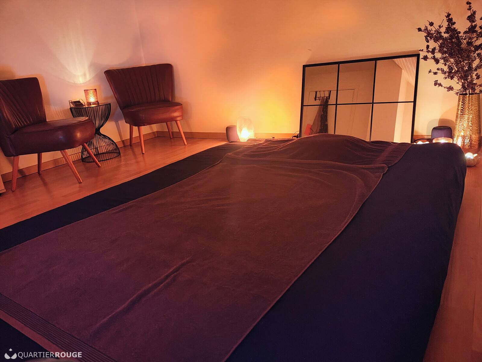 Le temps de la douche et de la discussion ne sont pas considérés comme temps de massage, prévoyez donc un peu plus de temps sur place, svp.